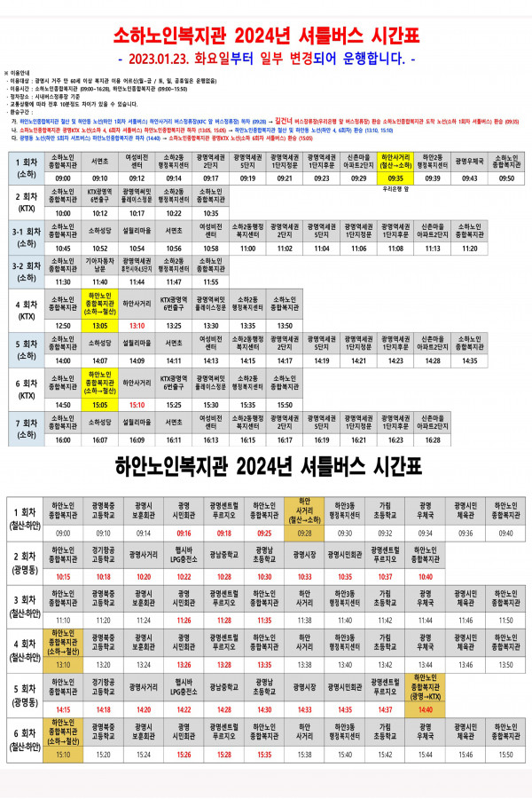 2024년 소하노인종합복지관 셔틀버스 노선표 변경 운영 안내(01.23 적용 운영)