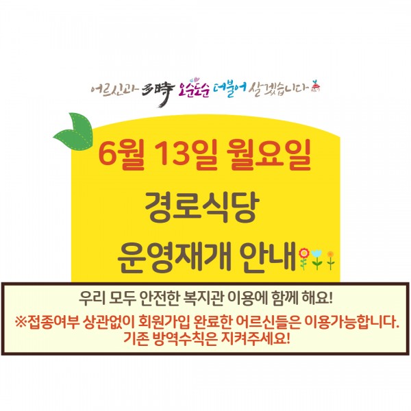 *6월 15일부터 접종여부 관계없이 회원가입 어르신이면 경로식당 이용이 가능합니다. 방역수칙은 지켜주세요!