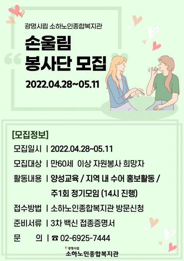 우리 소하노인종합복지관에서는 2022년 늘푸른선배시민봉사단 '손울림봉사단' 참여자를 다음과 같이 모집합니다.