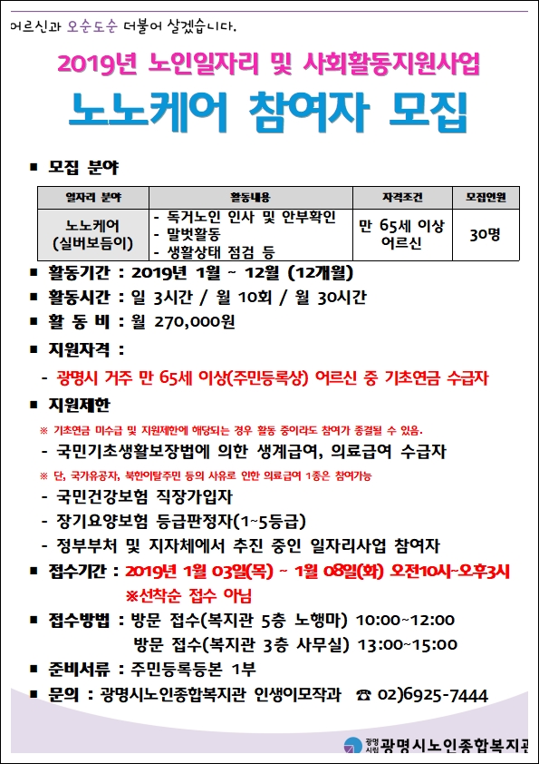 2019년 노인일자리 및 노인사회활동지원사업 '노노케어' 참여자 모집 [완료]