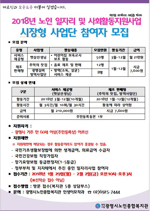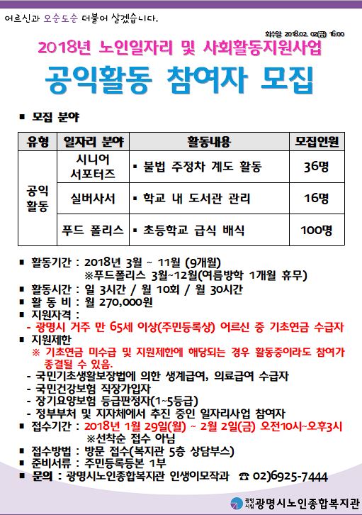 2018년 노인일자리 및 사회활동지원사업 참여자 공개모집