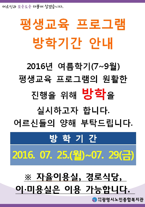 안녕하세요. 광명시노인종합복지관 평생교육 프로그램 방학을 안내해 드립니다.