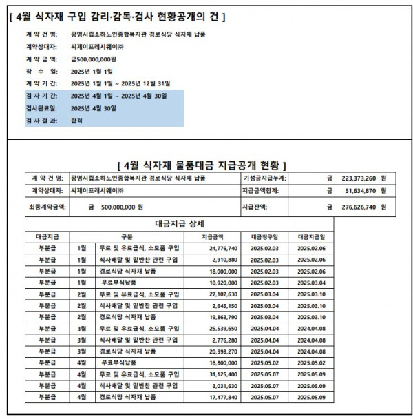 4월 식자재 구입 검수 현황 및 물품대금지급 공개의 건