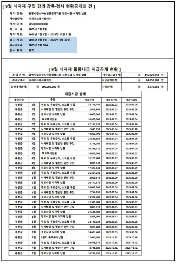 9월 식자재 구입 검수 현황 및 물품대금지급 공개의 건