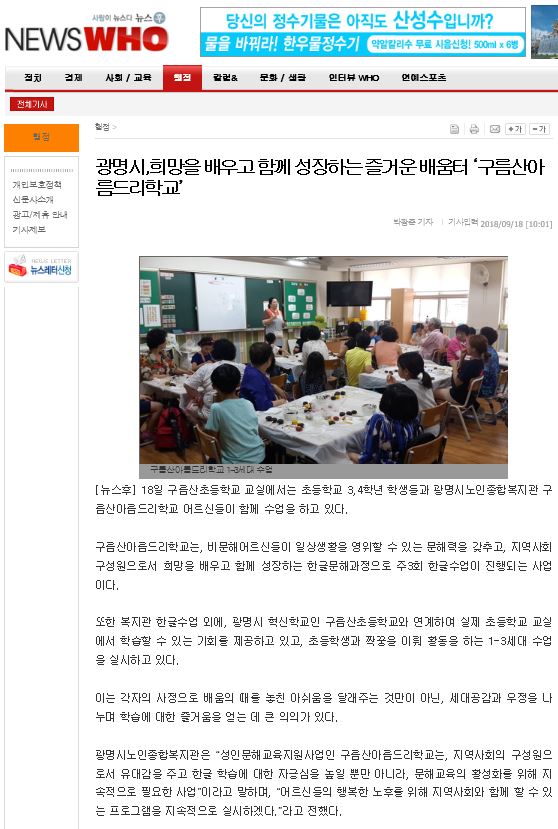 광명시 구름산아름드리학교, 혁신학교 연계 한글수업 진행 - NSP통신