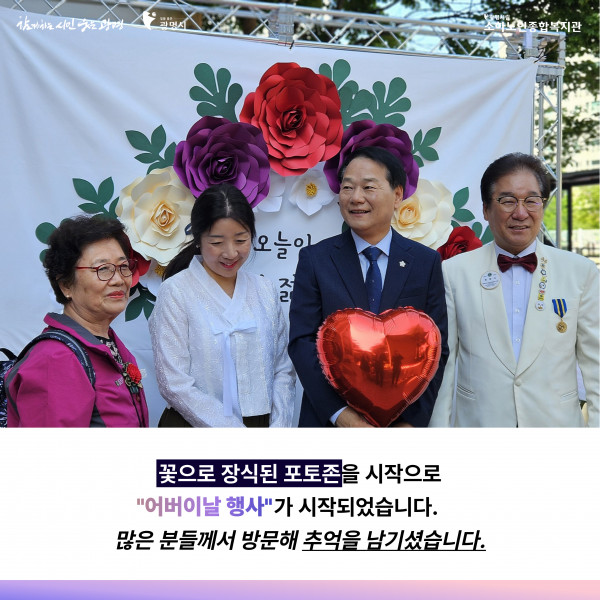 이날 행사는 총 800명의 복지관 어르신들이 함께 참여한 가운데, 카네이션 나눔, 기념행사, 문화공연, 천원의 만찬이 진행되었습니다.