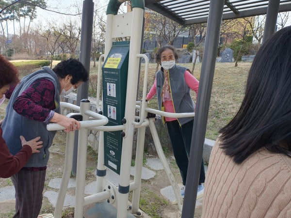 걷기도 하고 운동기구에서 다리운동, 허리운동도 해보시고 길가에 새싹도 보시고,