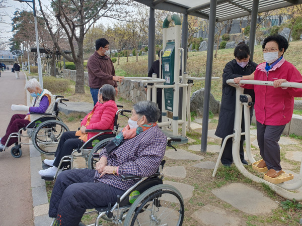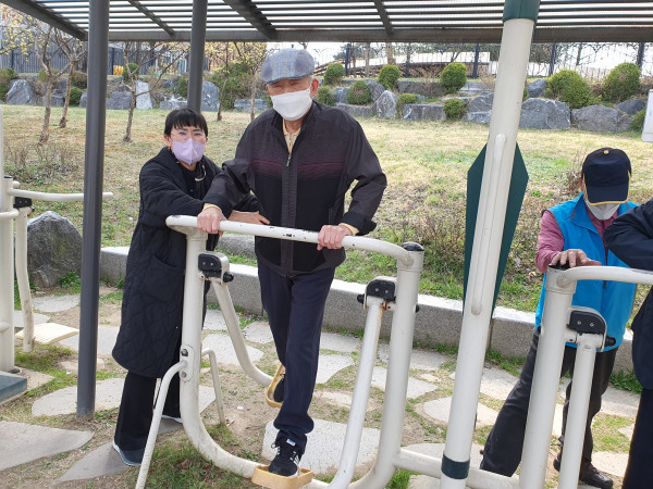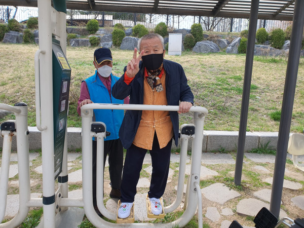 남자 어르신들은 꽃구경보다는 운동 위주로 걷기나 기구 운동을 많이 하셨고,