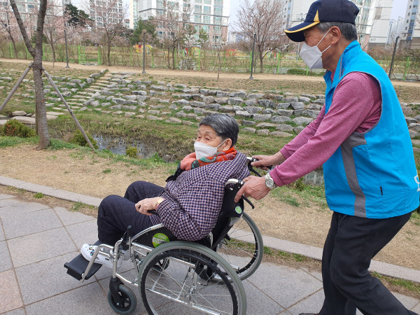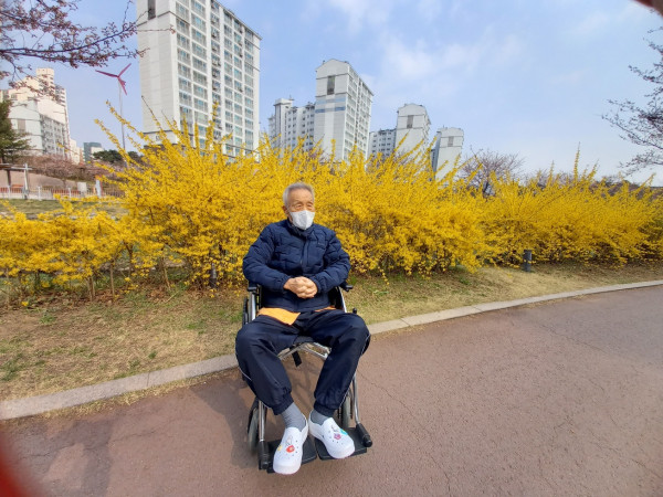 김*기 어르신은 평소 걸어 다니시다 금일은 휠체어를 타고 가시며 가장 기쁜 날이라고 하시고,