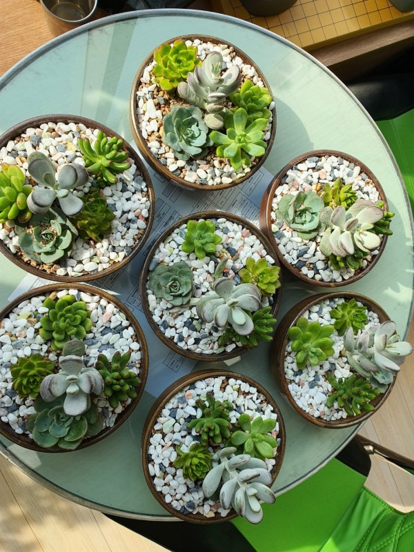 예전엔 다육이 한개를 작은 화분에 심어봤는데 이번엔 다육이 5개를 중간싸이즈 예쁜 항아리 화분에
