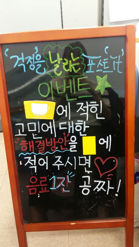 포스트잇에 적어서 붙여주시면 2000원 이하의 음료 1잔을 무료로 드립니다.