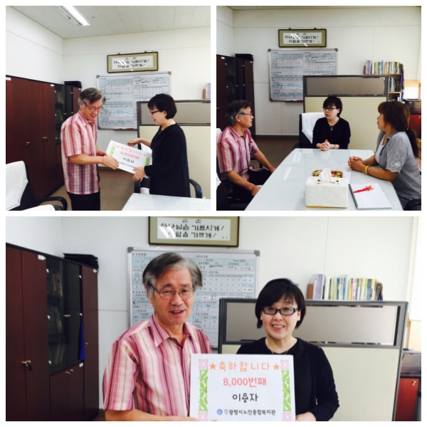 드디어 오늘 2015년 9월 18일 8,000번째 어르신이 등록하셨습니다.행운의 8,000번!! 복지관 이용자로 등록한 ‘송춘섭’ 어르신은 취미생활을 즐기고자 저희 복지관을 방문하셨는데요.