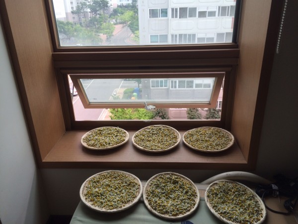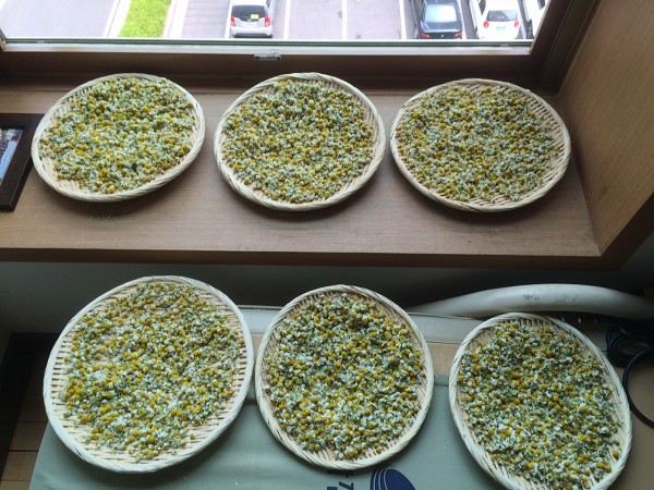 수확한 카모마일을 잘 말리는 작업이 중요하기에