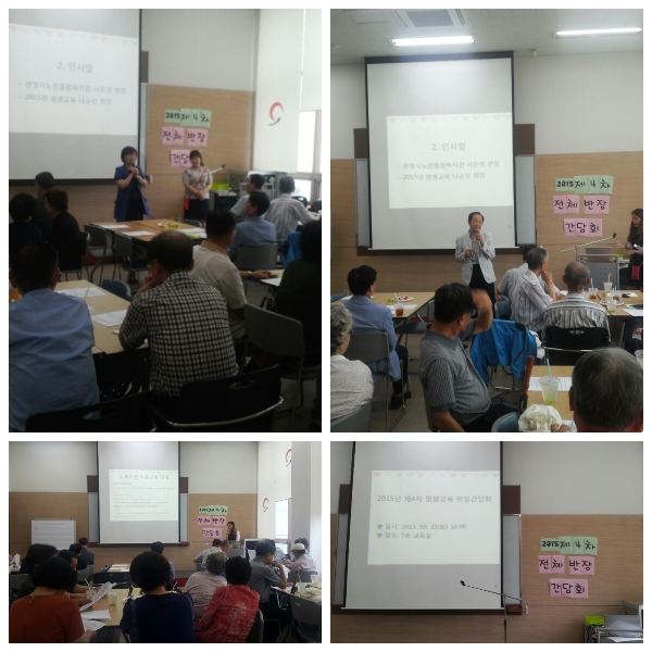 8/24 오후 2시 평생교육 반장대표단과 전체 반장님들이 모여 평생교육 4기 접수와 2015년 광명실버예술제에 대해 논의하는 시간을 가졌습니다. 평생교육 4기 접수를 위해 매우 집중하는 모습을 보여주셨는데요~ 매번 복지관을 위해 고생해주셔서 항상 감사드려요^^ 앞으로도 복지관 잘 부탁드립니다!!