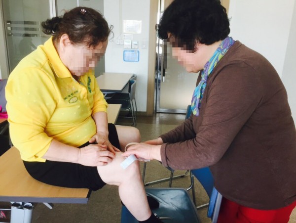 팀을 이루어 키네시오 테이프를 이용해 팀원에게 서로 무릎테이핑을 해주며 TV속 스포츠선수들이 사용하던 테이프를 직접 붙여보고 느껴볼 수 있는 좋은시간이 되었습니다^^