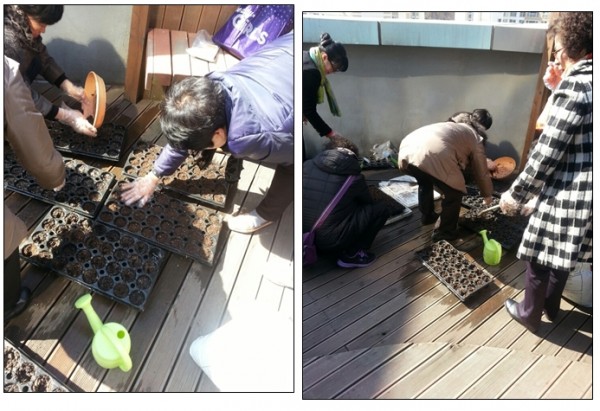 시니어가드닝에서는 활동 준비를 위해 오늘 복지관 옥상에 마련한 비닐하우스 앞에서 씨뿌리기 작업을 했습니다.