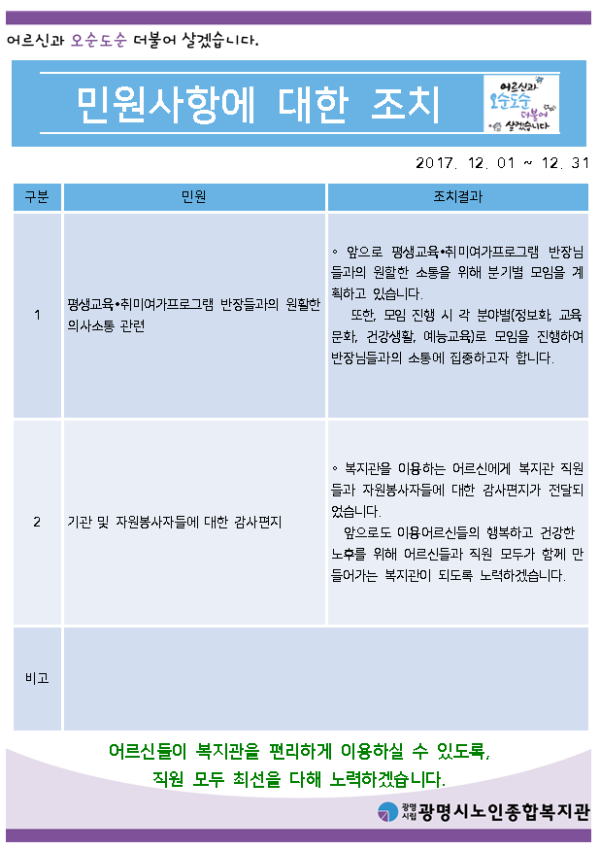 관리자님의 작성글 | 2017년 12월 민원에 대한 결과 공지