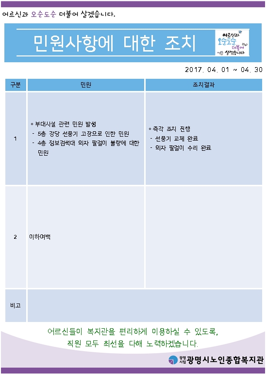 관리자님의 작성글 | 2017년 4월 민원에 대한 결과 공지
