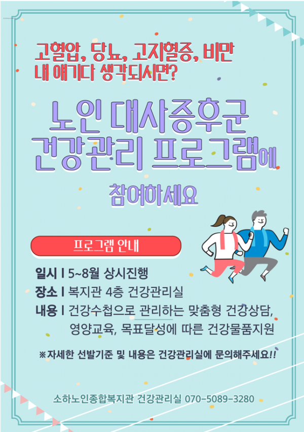 고혈압, 당뇨, 고지혈증, 비만, 모두 내 얘기다 생각되시면? [노인 대사증후군 건강관리 프로그램]에 참여하세요!!