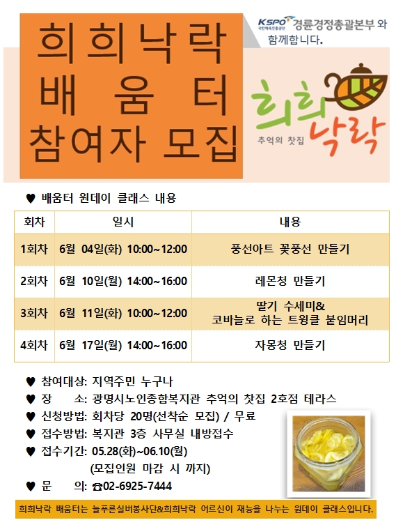 광명시노인종합복지관 추억의 찻집 희희낙락에서 지역주민을 위한 원데이 클래스 ‘배움터’를 운영합니다.