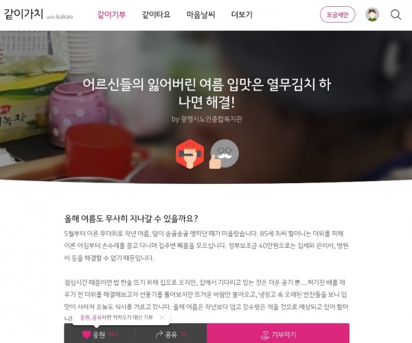 ‘여름 김치 마련을 위한 카카오 같이가치 모금함’이 개설되었습니다.