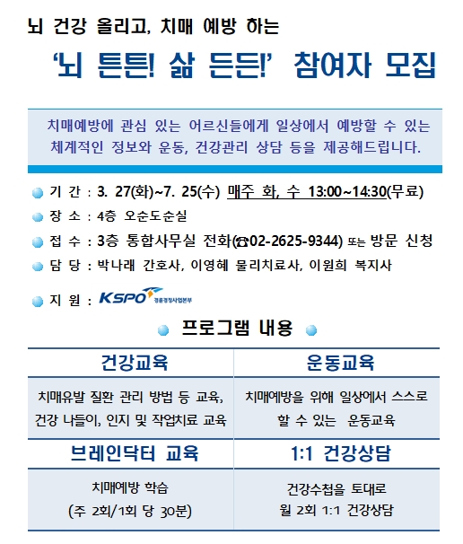 뇌 건강 올리고, 치매 예방 하는 ‘뇌 튼튼! 삶 든든!’ 참여자 모집 [완료]