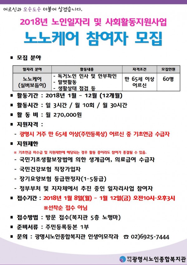 2018년 노인일자리 및 사회활동지원사업 노노케어 사업단 참여자 모집