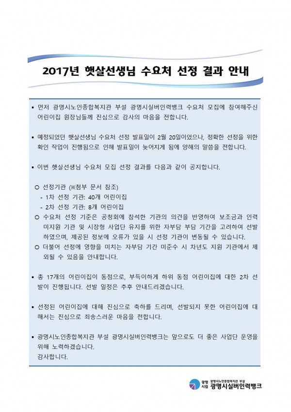 2017년 노인일자리 및 사회활동지원사업 '햇살선생님' 수요처 선정 안내