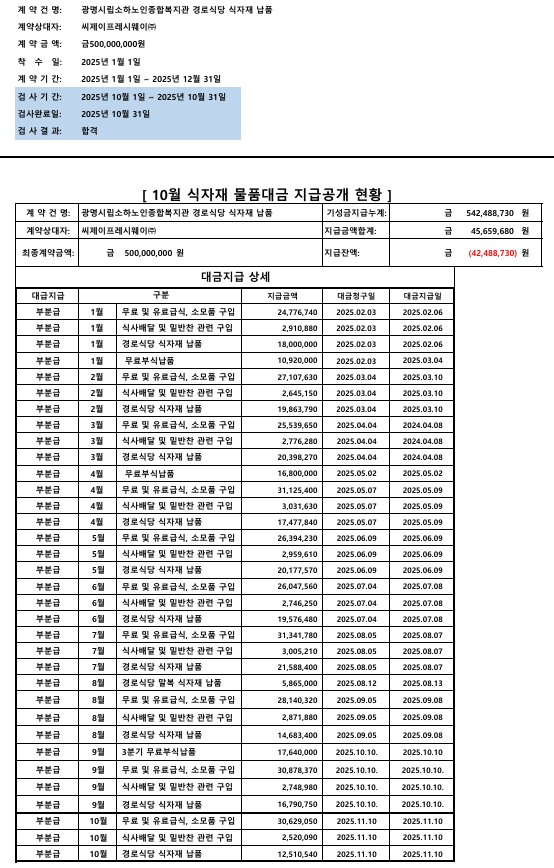 10월 식자재 구입 검수 현황 및 물품대금지급 공개의 건