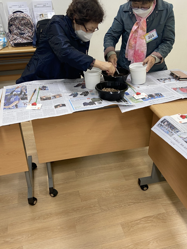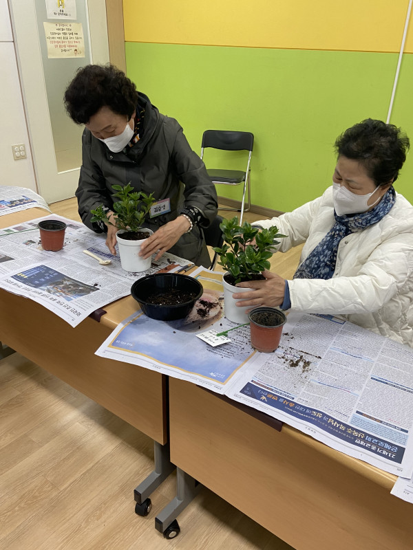 어르신들은 화분에 구멍도 뚫고 마사토와 용토를 넣고 다져주면서 꽃치자 심기에 열중하고