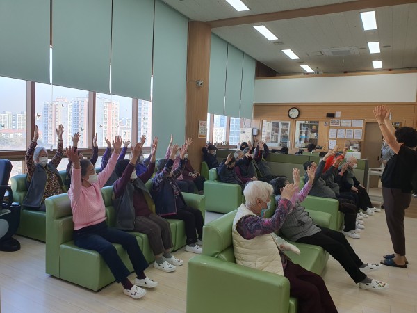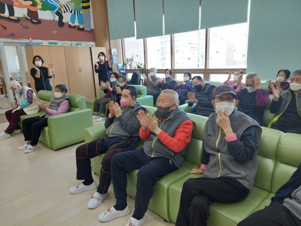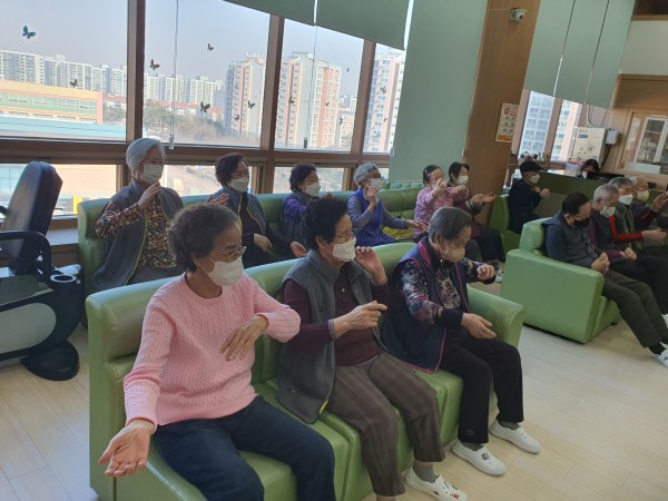 신나는 음악소리와 강사님의 구령에 맞추어 어르신들의 율동과 웃음소리도 점점 더 커진답니다.