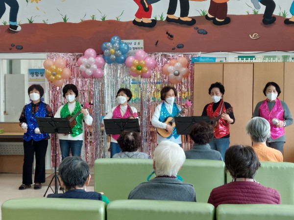 우쿠렐레 공연에 앞으로 나오셔서 어린아이처럼 춤도 추시고, 음악소리에 맞추어 강사를 따라 손 유희, 팔과 다리운동을 하는 우리 어르신들~~