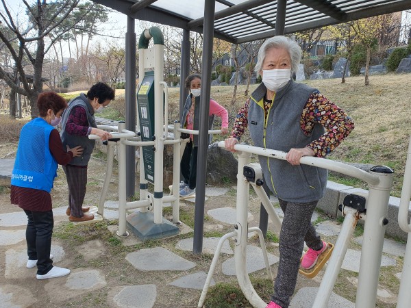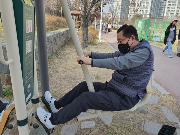 걷기도 하고 운동기구에서 다리운동, 허리운동도 해보시고 길가에 새싹도 보시고,