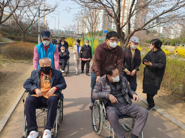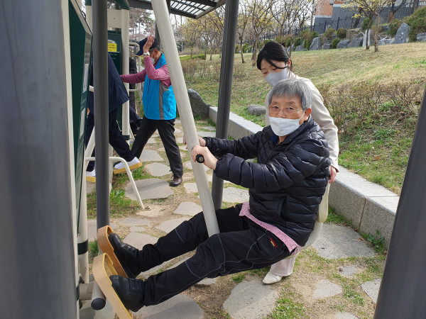 남자 어르신들은 꽃구경보다는 운동 위주로 걷기나 기구 운동을 많이 하셨고,