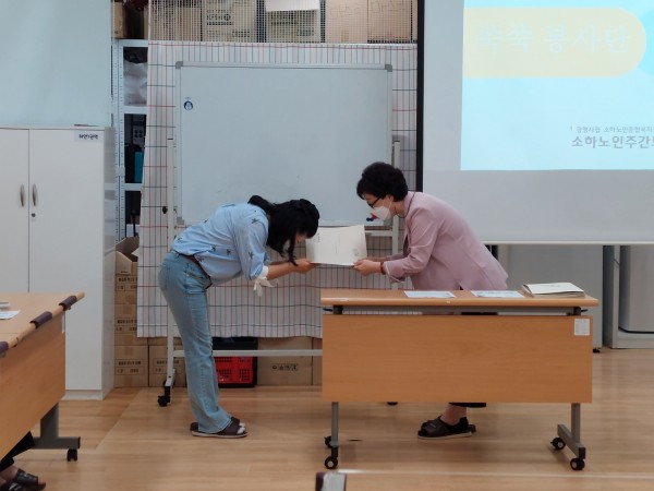 본 활동에 앞서 우리 소하노인주간보호센터와 어르신들에 대한 이해를 돕는 오리엔테이션, 봉사 중에 반드시 숙지하고 유의해야할 자원봉사 보수교육이 진행되었습니다.