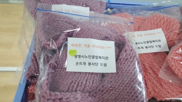 손뜨개 봉사단에서 겨울동안 광명시독거노인종합지원센터 어르신들에게 전달하기 위해 \'목도리\'를 열심히 짜 주셨습니다.