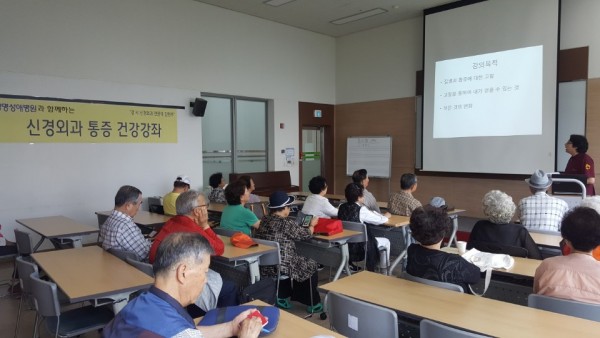 어르신들의 건강관리를 위해 5월 30일 광명성애병원에서 김현주 전문의를 모시고 \'신경외과 통증\'에 대한 건강강좌가 진행되었습니다.