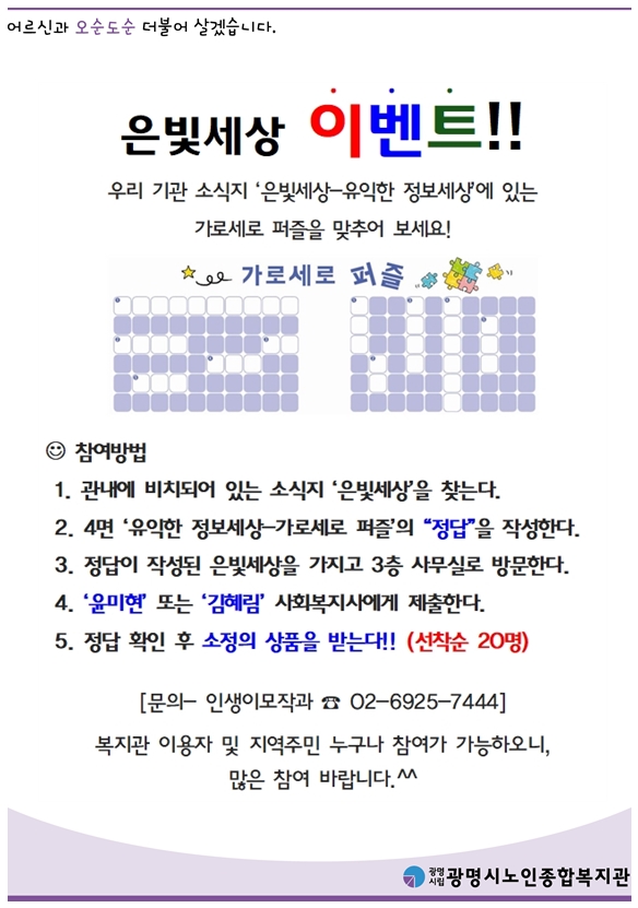 복지관 곳곳에 비치되어 있는 은빛세상을 찾아 재밌는 ‘가로세로 퍼즐’을 맞춰보세요!