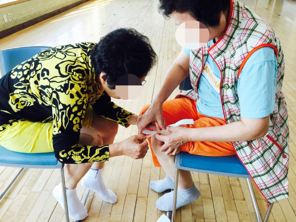 짝을 이루어 키네시오 테이프를 이용해 서로 무릎테이핑을 해주며