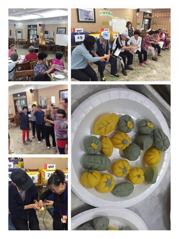 오늘 추석을 맞이하여 복지관 어르신들이 함께 예쁜 호박송편과 잎송편을 만드는 시간을 가졌습니다!! 처음 만드는 모양이지만 처음이 아닌 것처럼 다들 매우 잘만드셔서 매우 놀랐습니다!! 송편이 쪄지는동안 숟가락으로 탁구공 만들기 게임과 협동심게임이 진행되었는데 어르신들이 적극적으로 참여해주셔서 모두에게 즐거운 시간이 되었습니다^^ 오늘 즐거운 시간을 보낸 만큼 추석명절에도 모두 즐거운시간 되시길 바랍니다!! 참여해주신분들 모두 수고많았습니다~~~