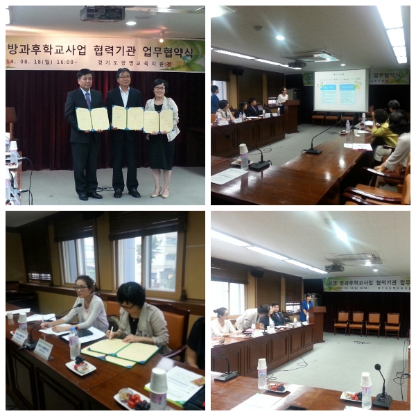 2014. 8. 18 광명시교육지원청과 방과후학교 지역사회 연계프로그램 협약식이 진행되었습니다. 우리복지관은 교육청에 지원을 받아 자신들의 경험을 다음세대에 나누는 별별학당이라는 프로그램을 1년간 진행하게 되었습니다. 이번 협약을 통해 노인복지관으로서 초등학교와 함께하여 1.3세대 통합을 실천할 수 있게 되었으며 어르신들의 사회참여를 확대하여 새로운 일자리를 제공할 수 있게 되었습니다. 이러한 기회를 제공해 준 광명시교육지원청에 감사드립니다^^