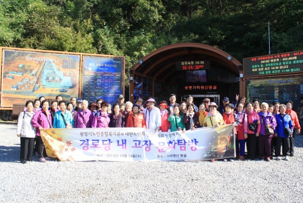 10월의 따뜻한 햇살이 쏟아지는 10월 16일 오전과 오후에 한 차례씩 소하, 하안, 학온동의 경로당 13개소의 100여명의 어르신과 함께 기분 좋게 광명시 문화자원인 가학동에 위치한 가학광산 탐방을 다녀왔습니다.^^