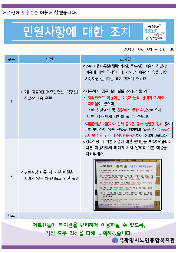 관리자님의 작성글 | 2017년 9월 민원에 대한 결과 공지