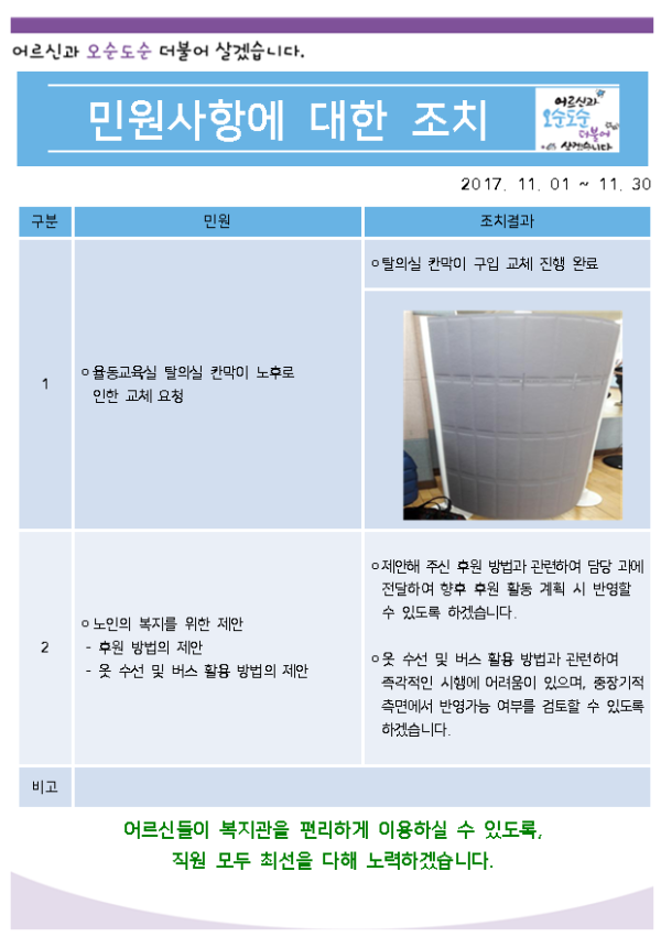 관리자님의 작성글 | 2017년 11월 민원에 대한 결과 공지